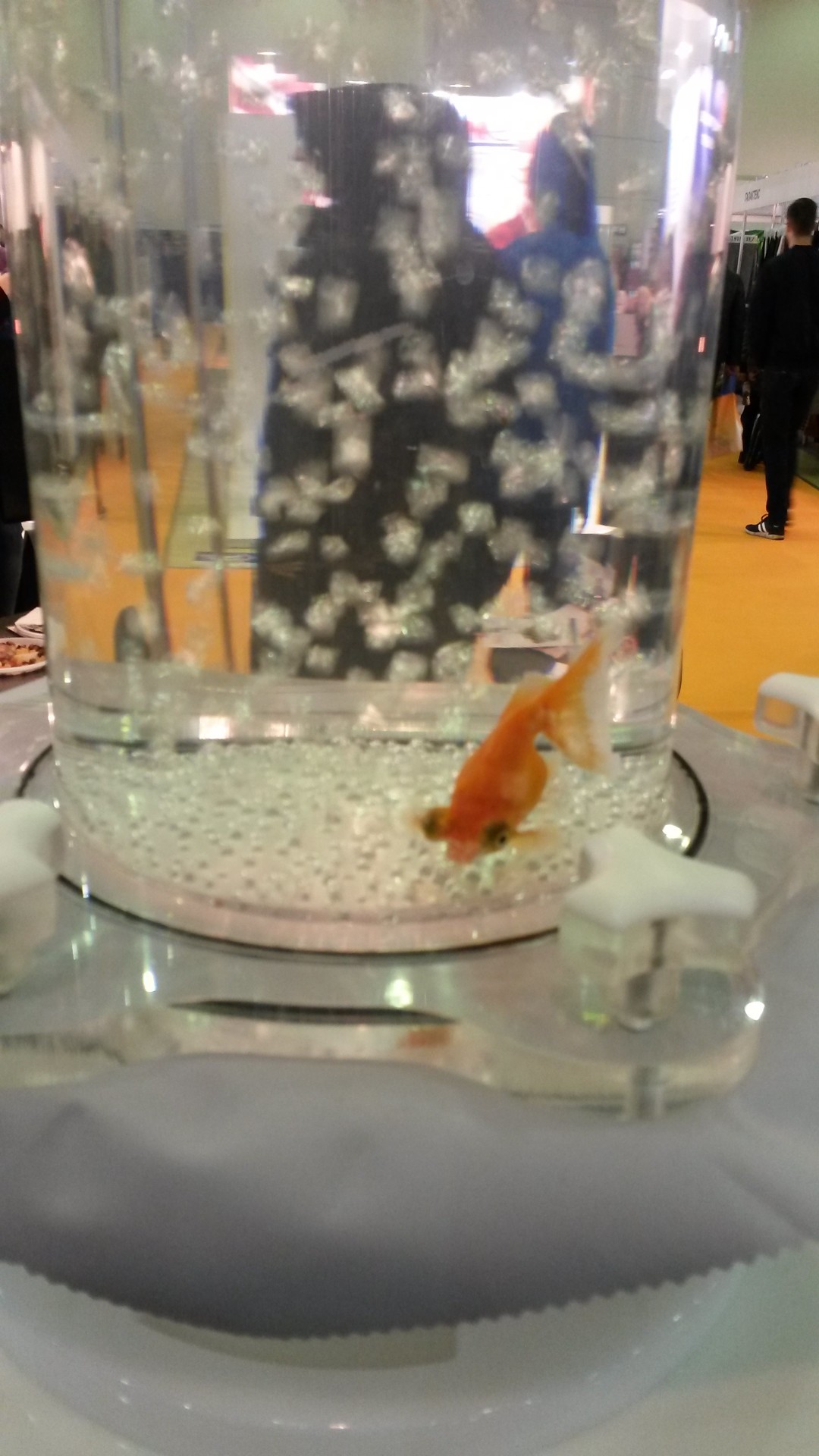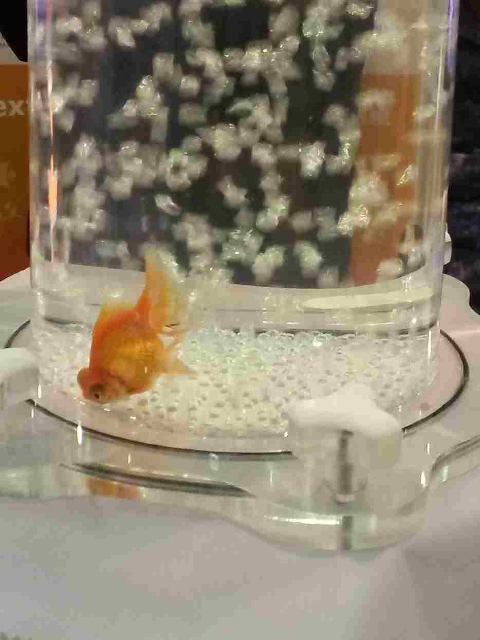 На фотографиях ниже показан принцип действия мембраны, нанесенной на ткань. Колба с водой перевернута дном вверх и расположена на подставке. Подставка накрыта мембранной тканью, под которую подается компрессором воздух для нормальной жизнедеятельности обитателей этого "аквариума". Как видно на снимках, воздух сквозь ткань проходит (мембрана пропускает воздух, дает дышать телу) и не пропускает воду из колбы (влагонепроницаемость одежды). И рыбка чувствует себя замечательно.