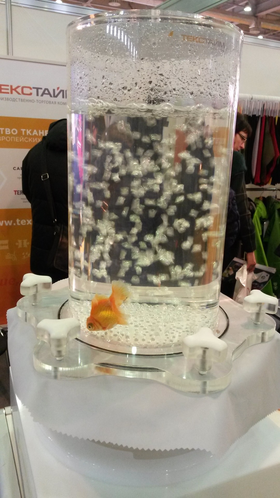 На фотографиях ниже показан принцип действия мембраны, нанесенной на ткань. Колба с водой перевернута дном вверх и расположена на подставке. Подставка накрыта мембранной тканью, под которую подается компрессором воздух для нормальной жизнедеятельности обитателей этого "аквариума". Как видно на снимках, воздух сквозь ткань проходит (мембрана пропускает воздух, дает дышать телу) и не пропускает воду из колбы (влагонепроницаемость одежды). И рыбка чувствует себя замечательно.